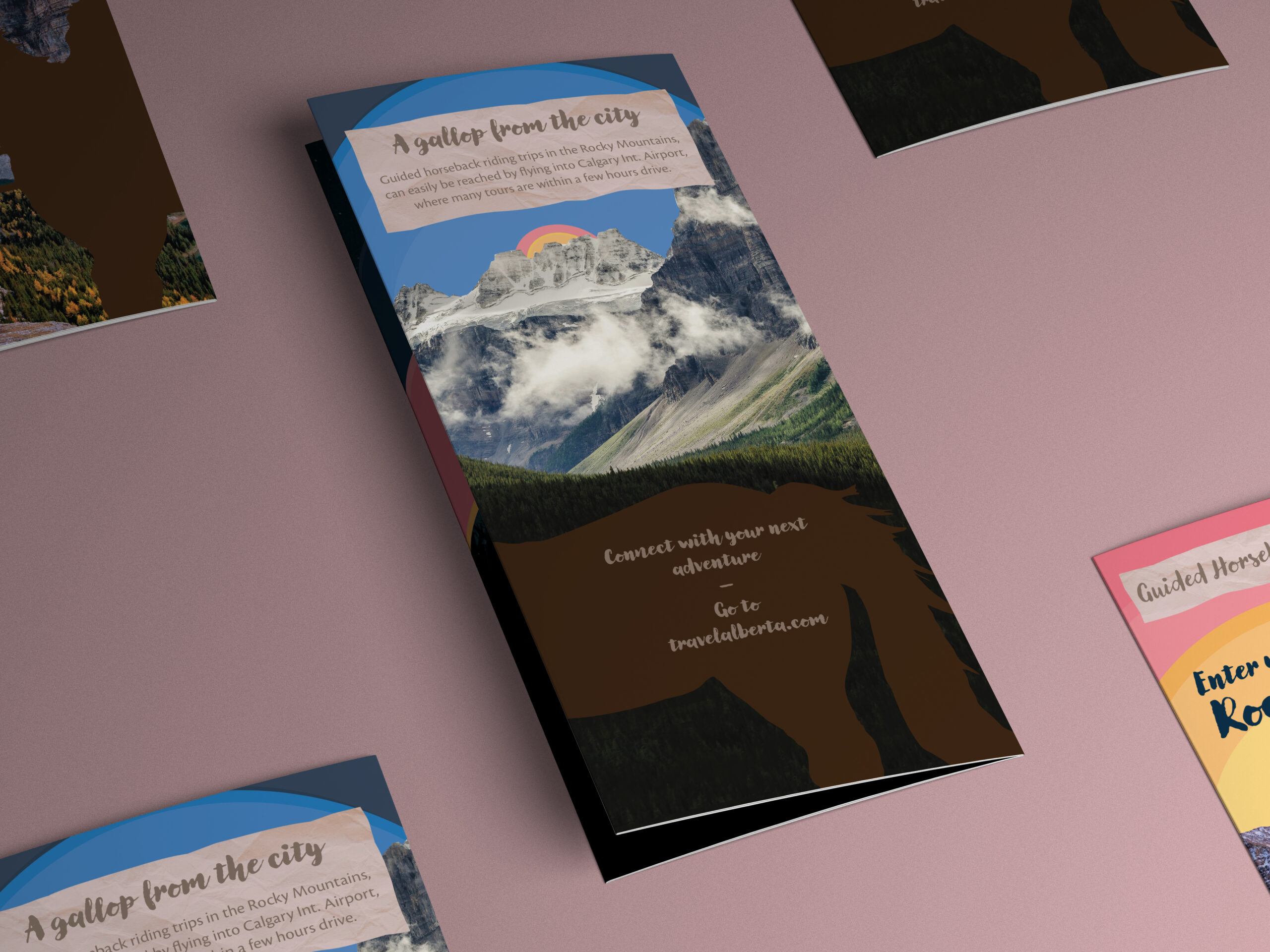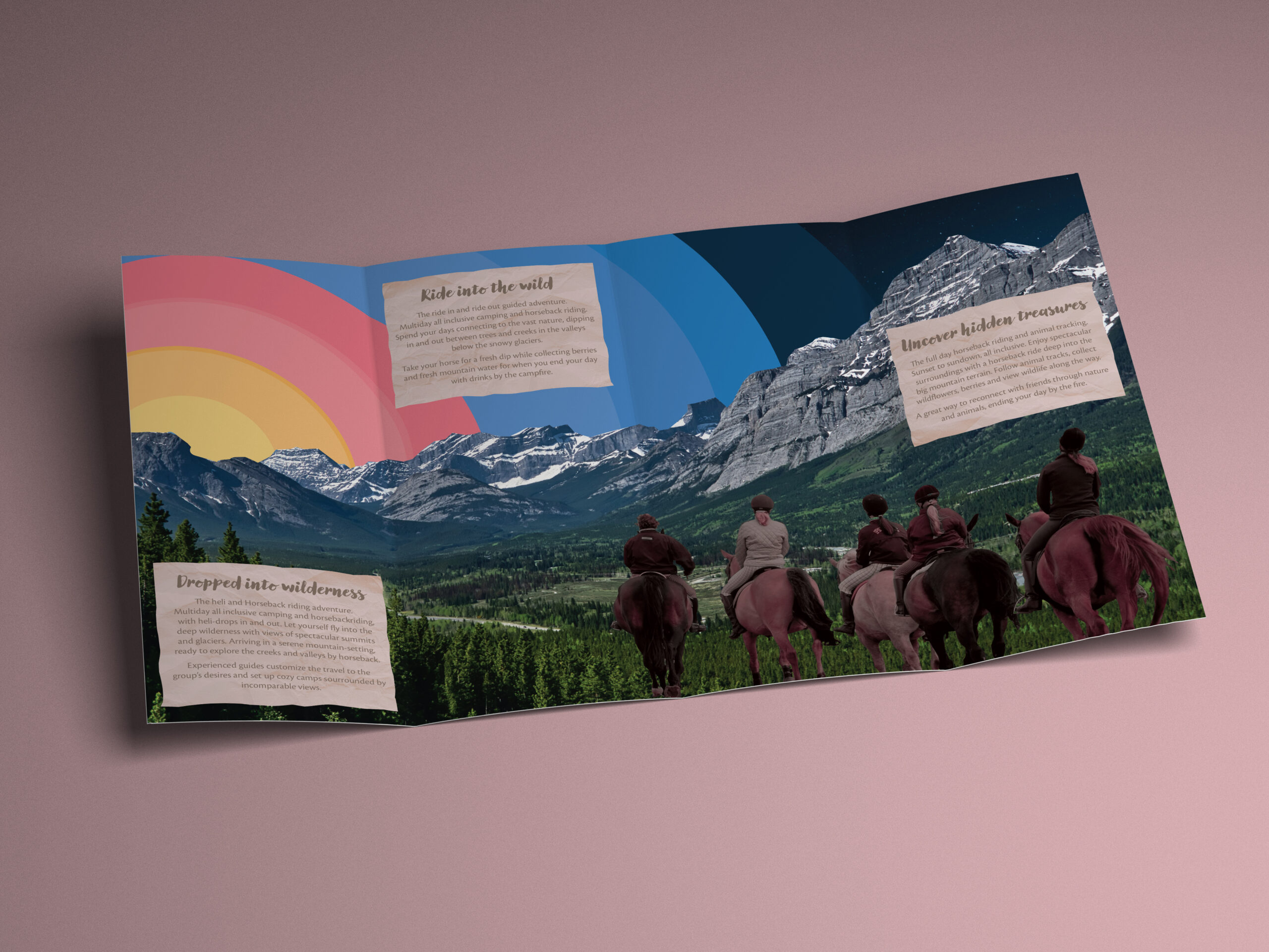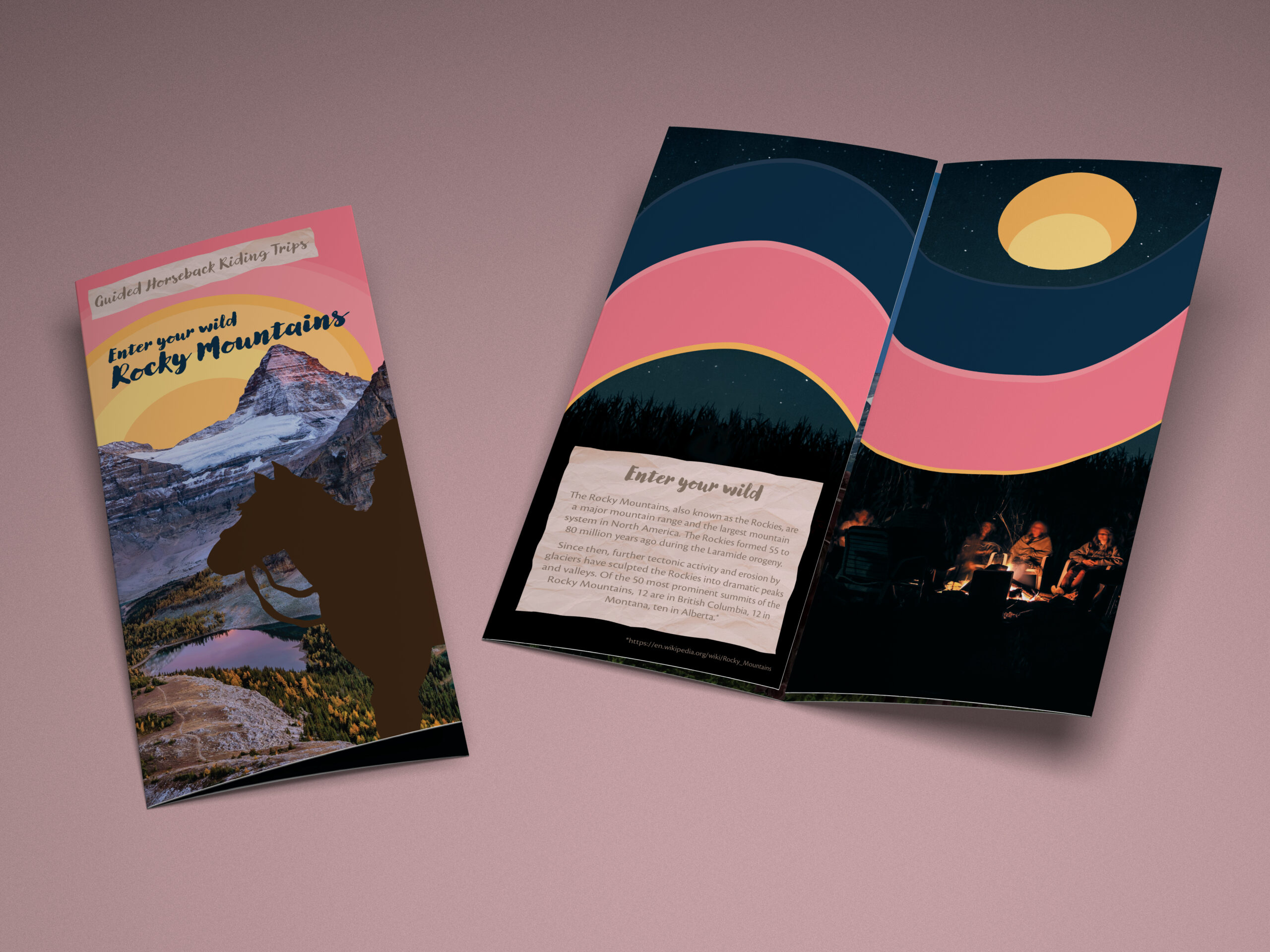 Travel brochure for guided horseback riding in the Rocky Mountains, targeting women 25-35 that are not necessarily experienced in the mountains.
