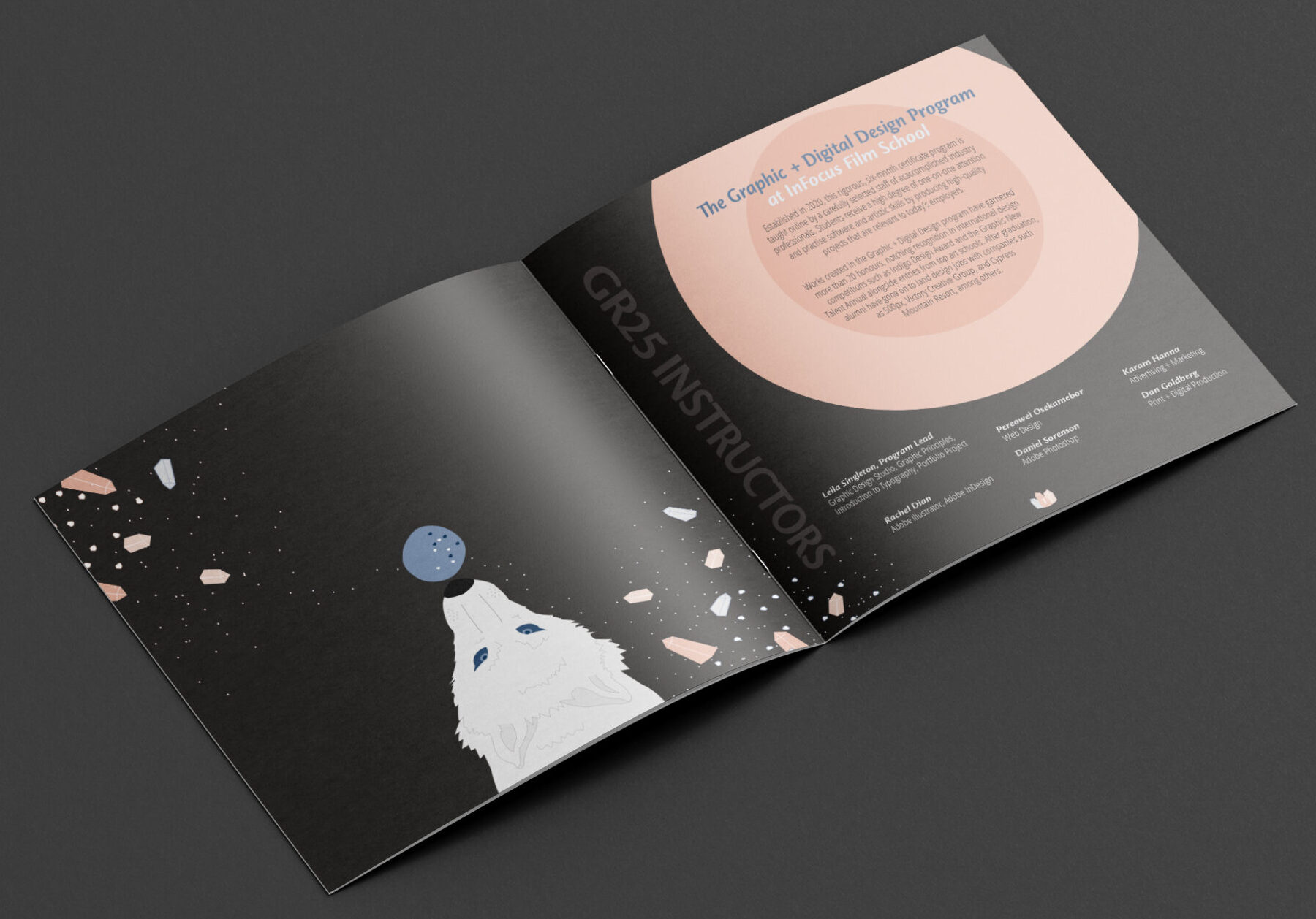 The feel was to be gloomy, unknown and mysterious, using tints (of InFocus Film School’s colour palette) that were muted with bright light contrasts from the wolf and crystals — representing the impact their actions have on their future. The “night” represents working in the dark and the “pushing rocks off a cliff” represents trusting the process.