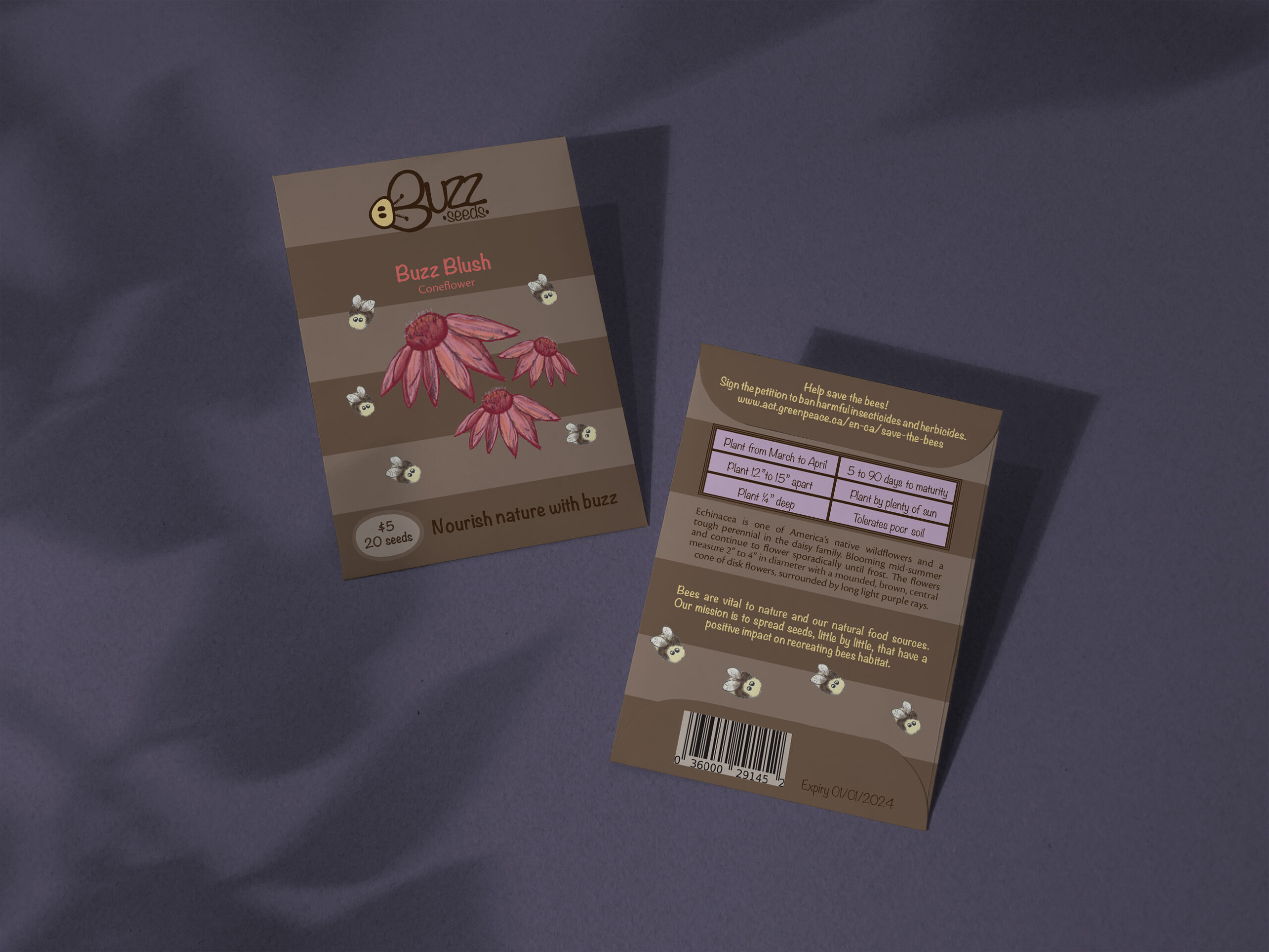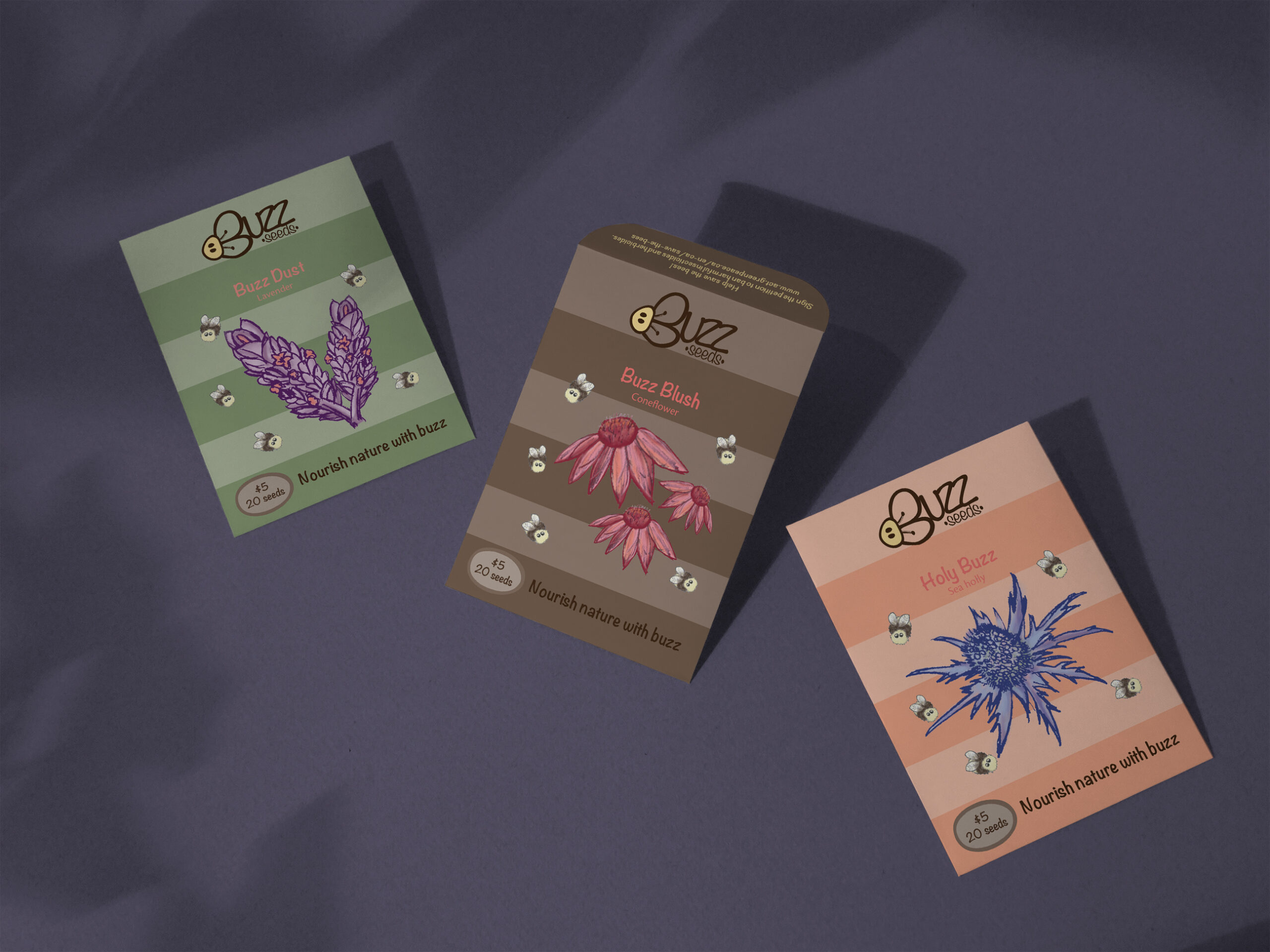 Design of three seed packages for wild flowers that contribute to recreating habitat for bees. In this case Lavender, Sea Holly and Coneflower. Bees are vital to nature and our natural food sources — 60% of beehives have disappeared the last 50 years.